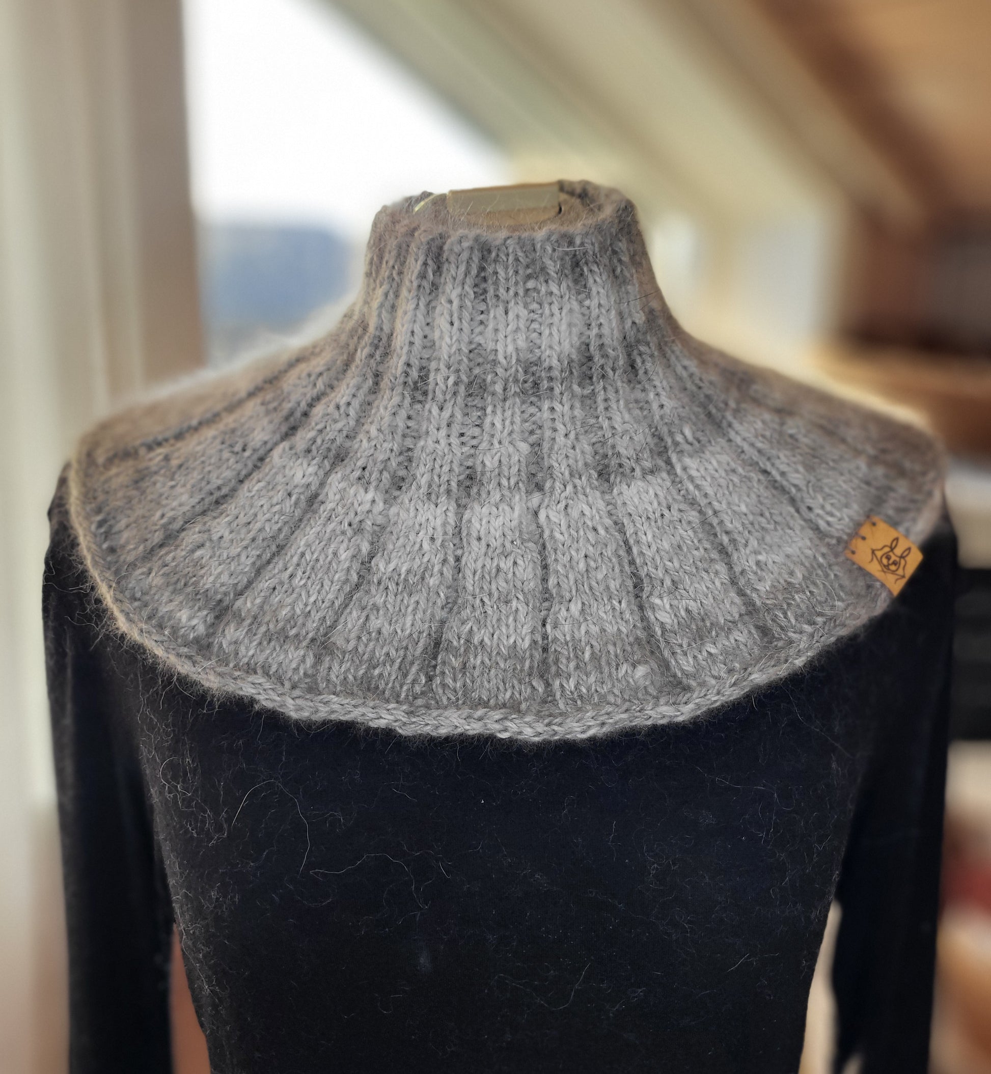 Strikket i håndspunnet angoragarn. Mål ca. 19 cm. målt fra halskanten midt på og ned. Fin og praktisk hals, som sitter pent rundt halsen. Spunnet i angorakaninenes naturlige originale farger, noe som gjør at halsen får en fin melering i ulike gråtoner. Passer både til mann og dame.