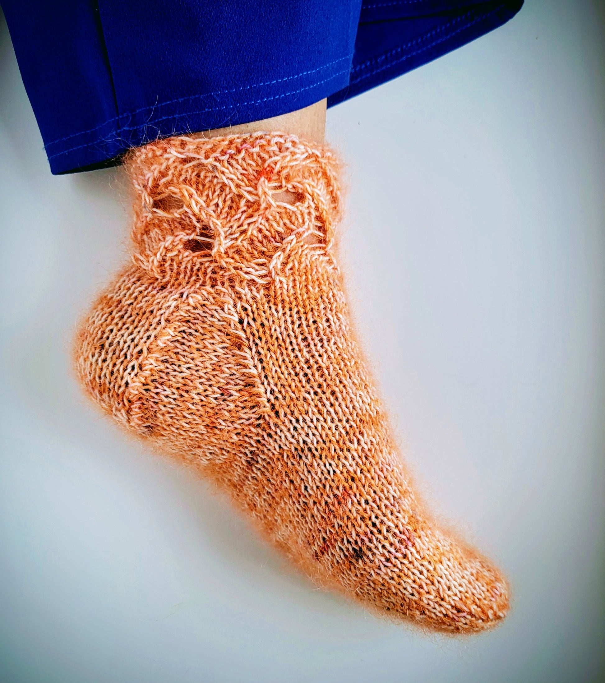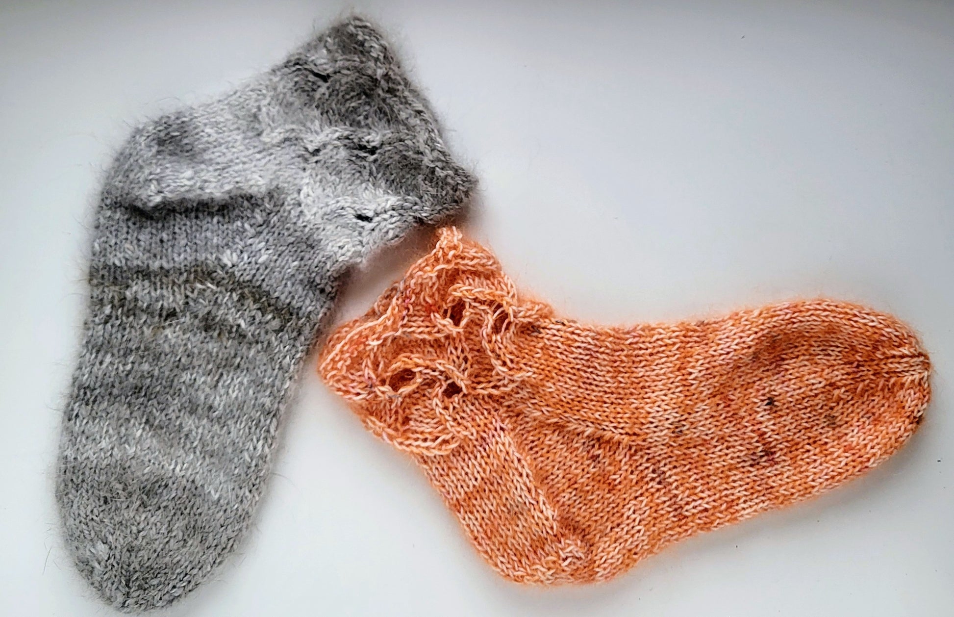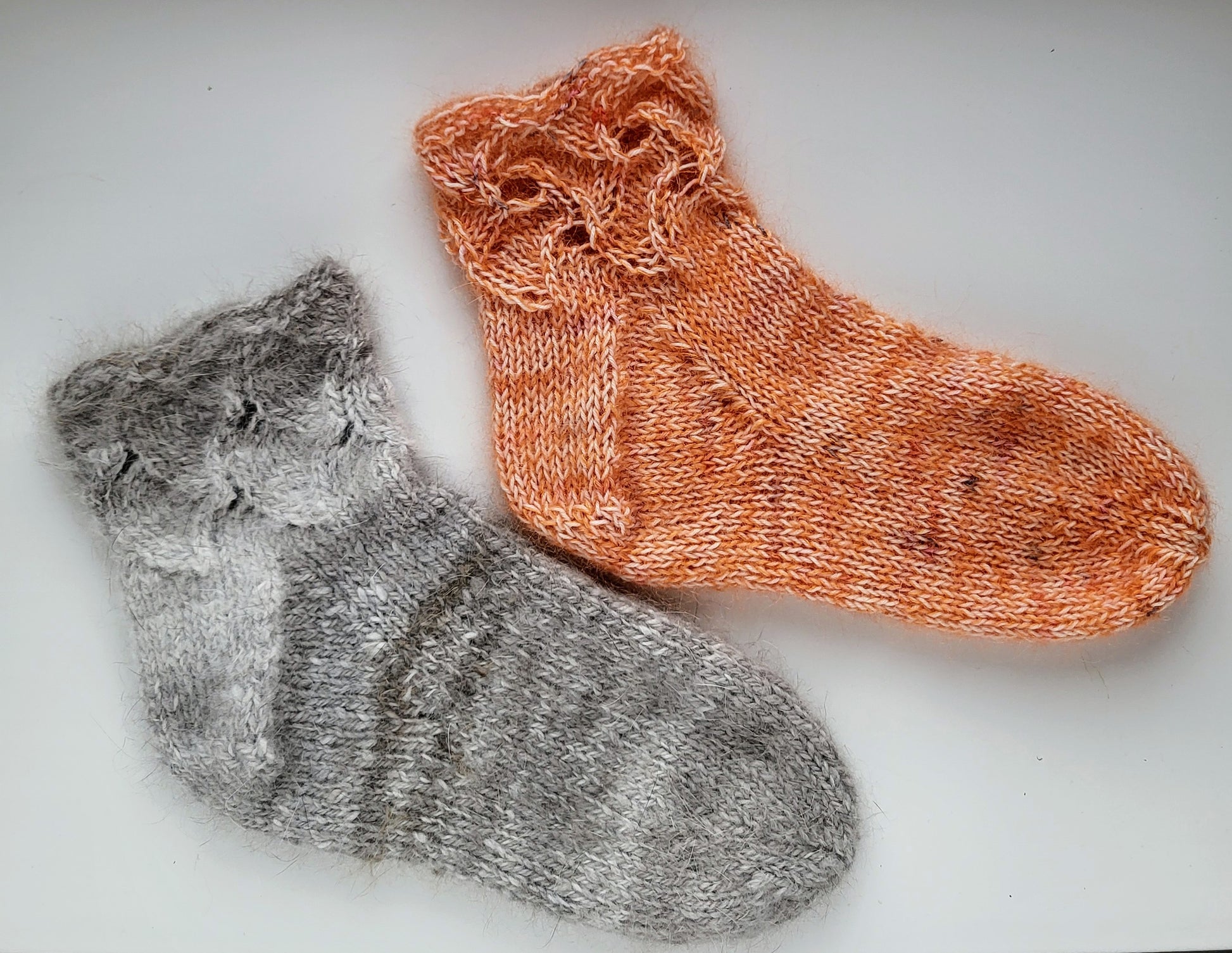 Digital nedlastbar strikkeoppskrift på enkle, og pene sokker, strikket i håndspunnet angoragarn. Annet DK garn kan også brukes, eventuelt 1 tråd tynn merino/annen ull, sammen med 1 tråd mohairgarn. Oppskriften kommer i str. 37-42, dame og strikkes på pinne 3,5. Sokkene er lette og kjappstrikka og passer perfekt til gavestrikk. Garnforbruk ca. 100 g.