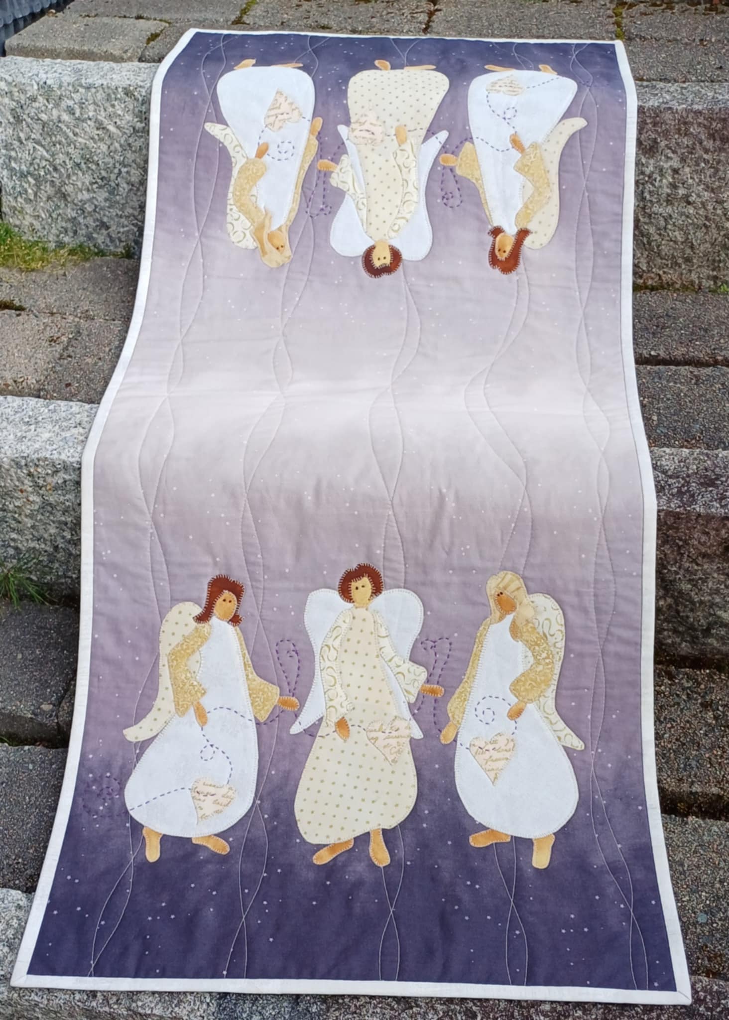 Nydelig applikert, håndbrodert og quiltet engleløper med forseggjorte detaljer. Lengde 106 cm, bredde 46 cm.