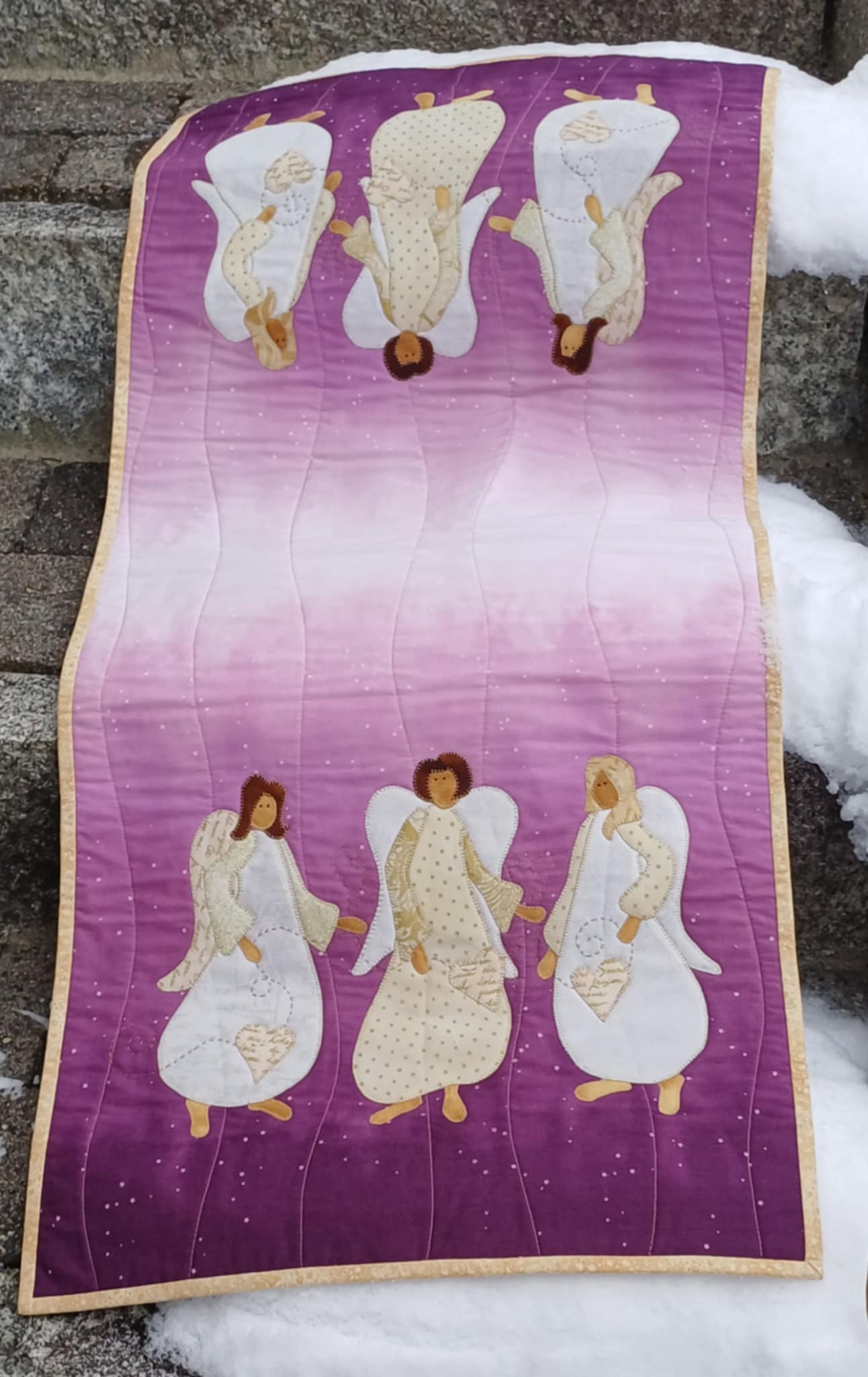 Applikert, håndbrodert og quiltet. Lengde 106 cm. Bredde 46 cm.