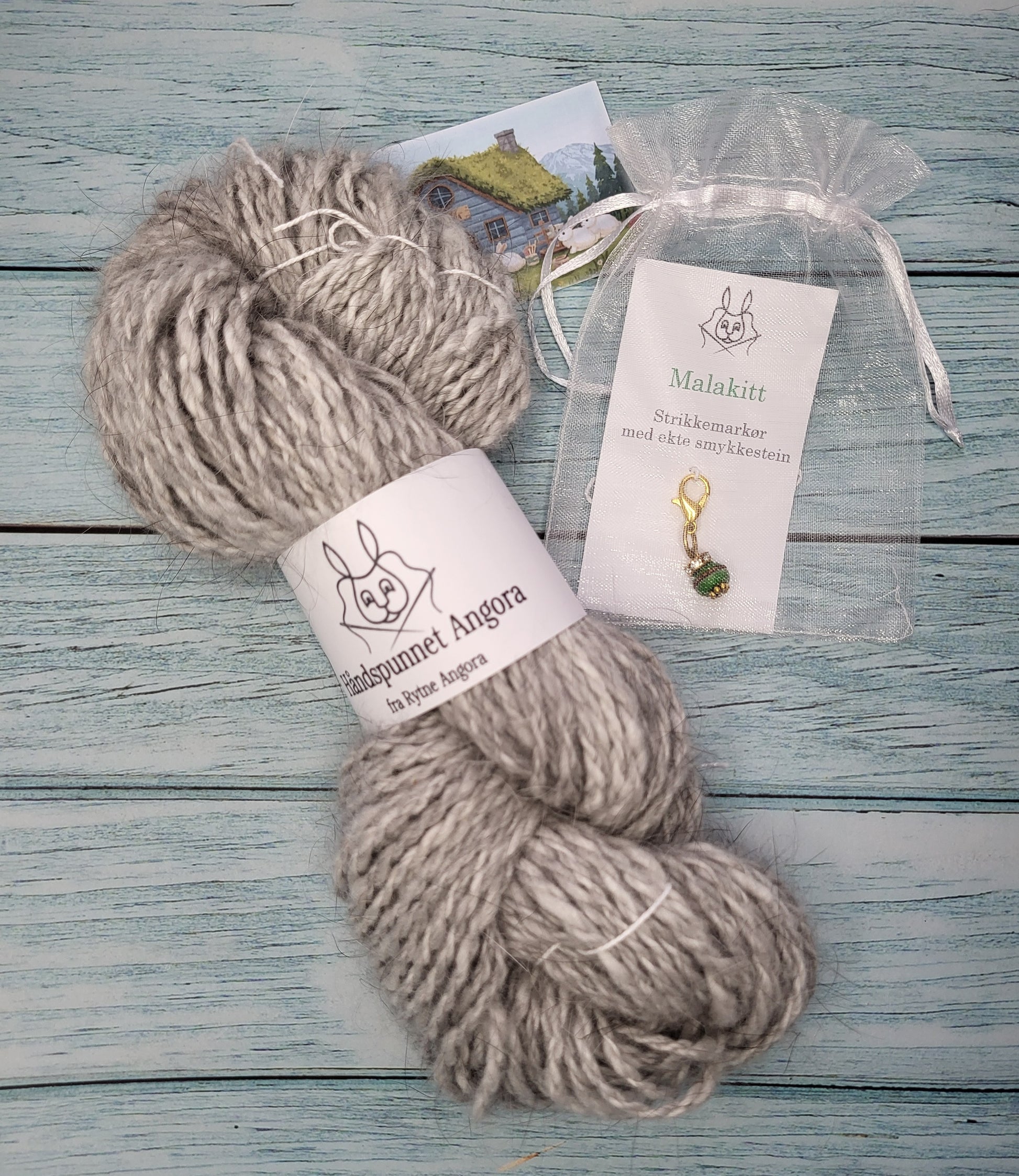 En unik og spesiell gave til en som strikker. Et hespe med håndspunnet angoragarn 60 g og en strikkemarkør, laget med ekte smykkestein, Malakitt.