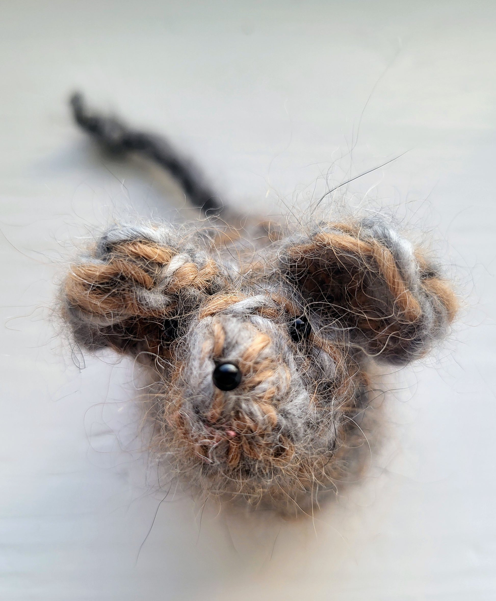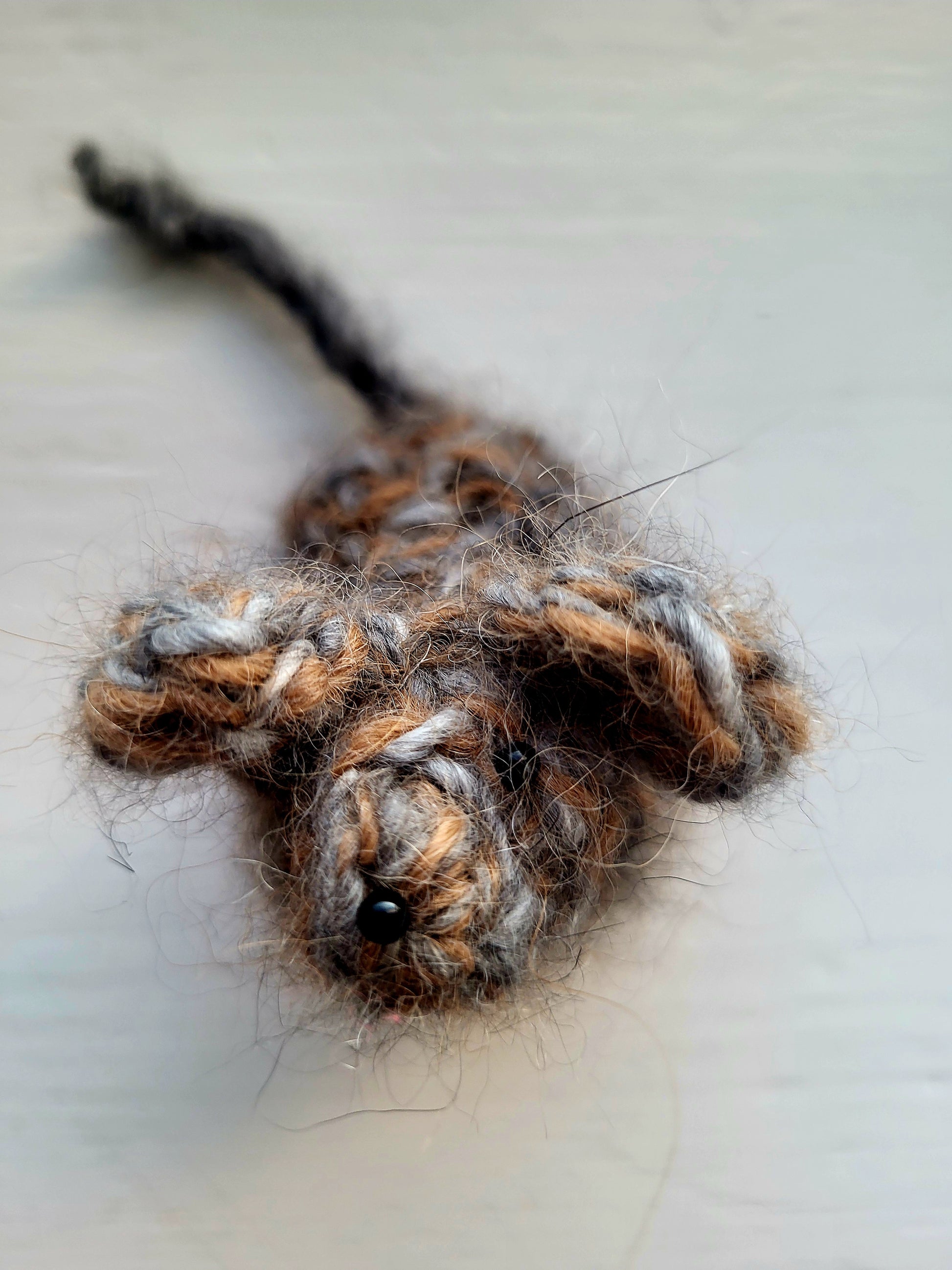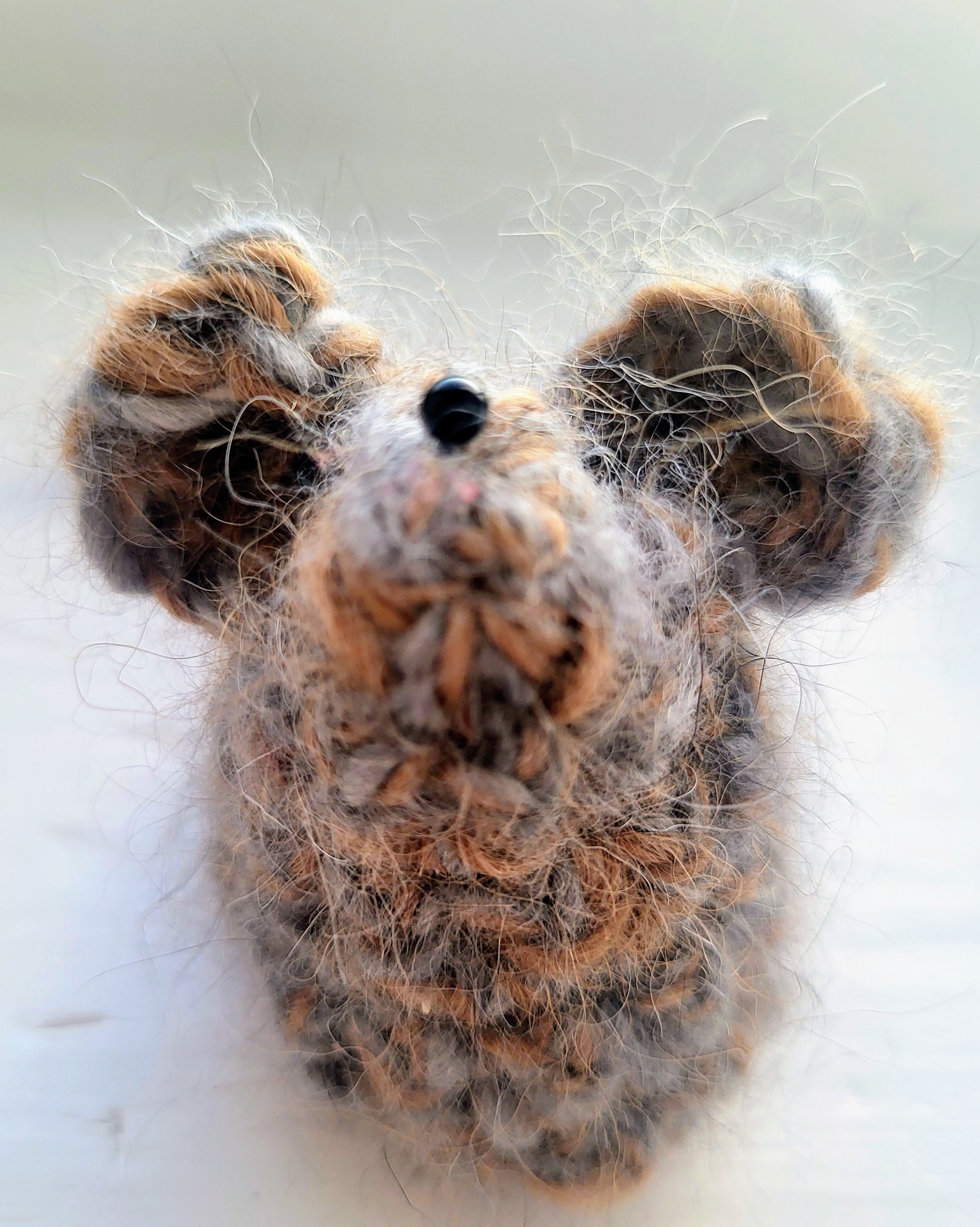 Hekleoppskrift på en sjarmerende liten ullmus. Du trenger valgfritt garn, heklenål som passer til, evnt. svarte perler til øyne og nese, en ullnål til å sy musa sammen, og litt vatt, ull eller garnrester til fyll.