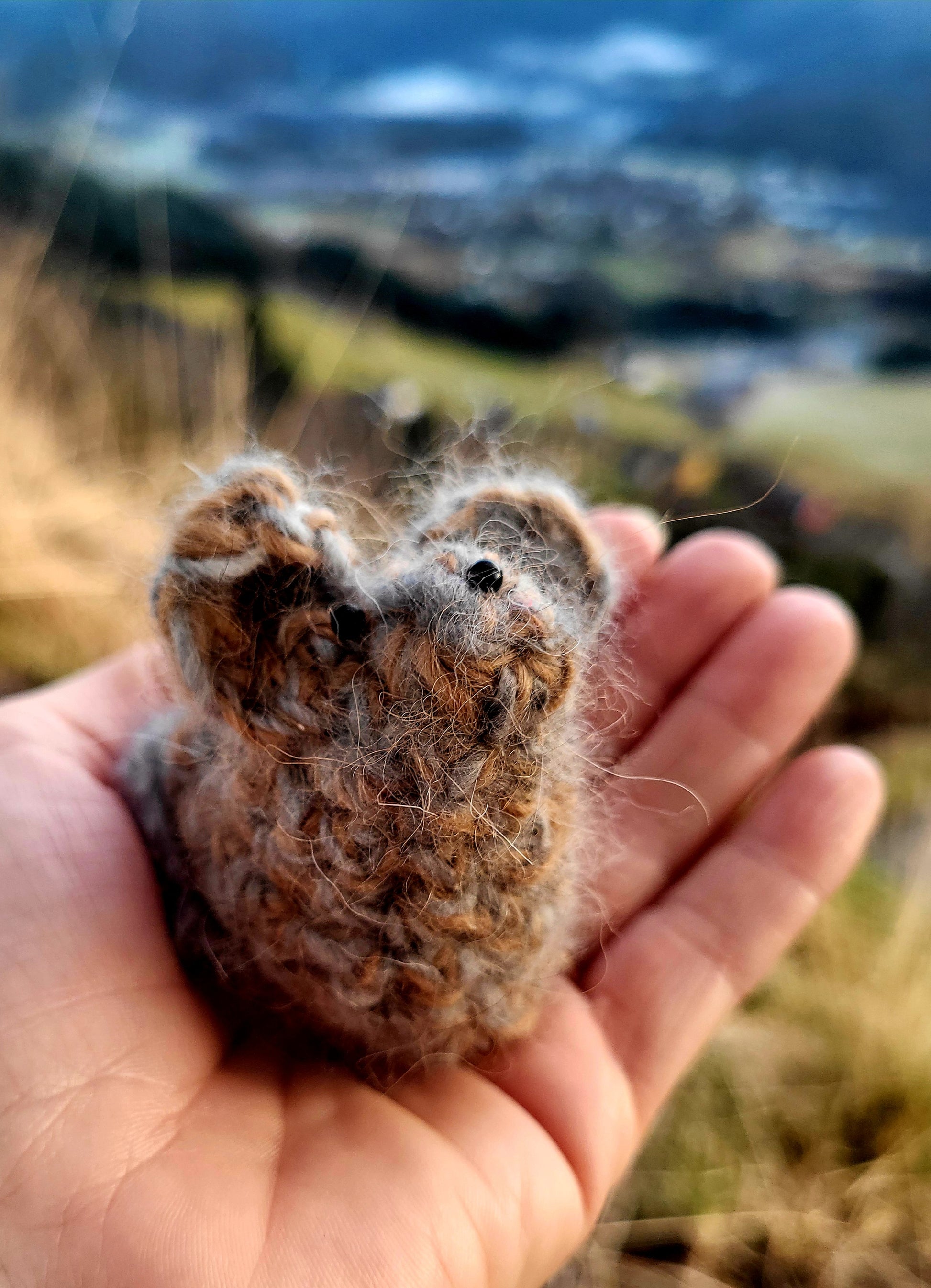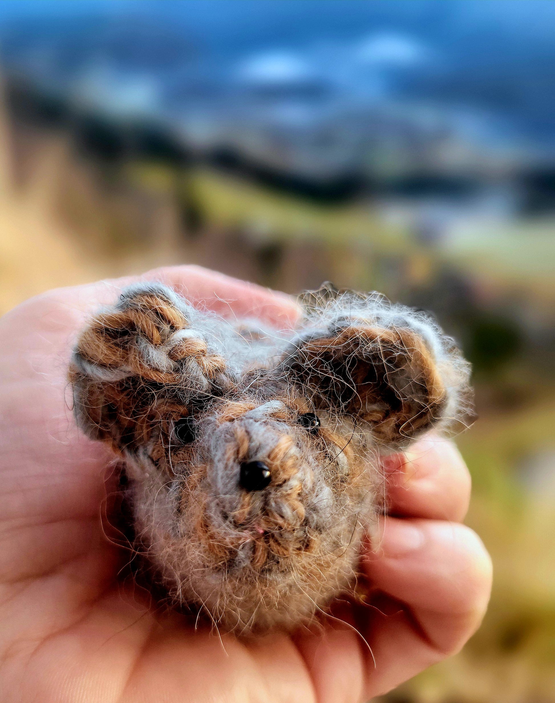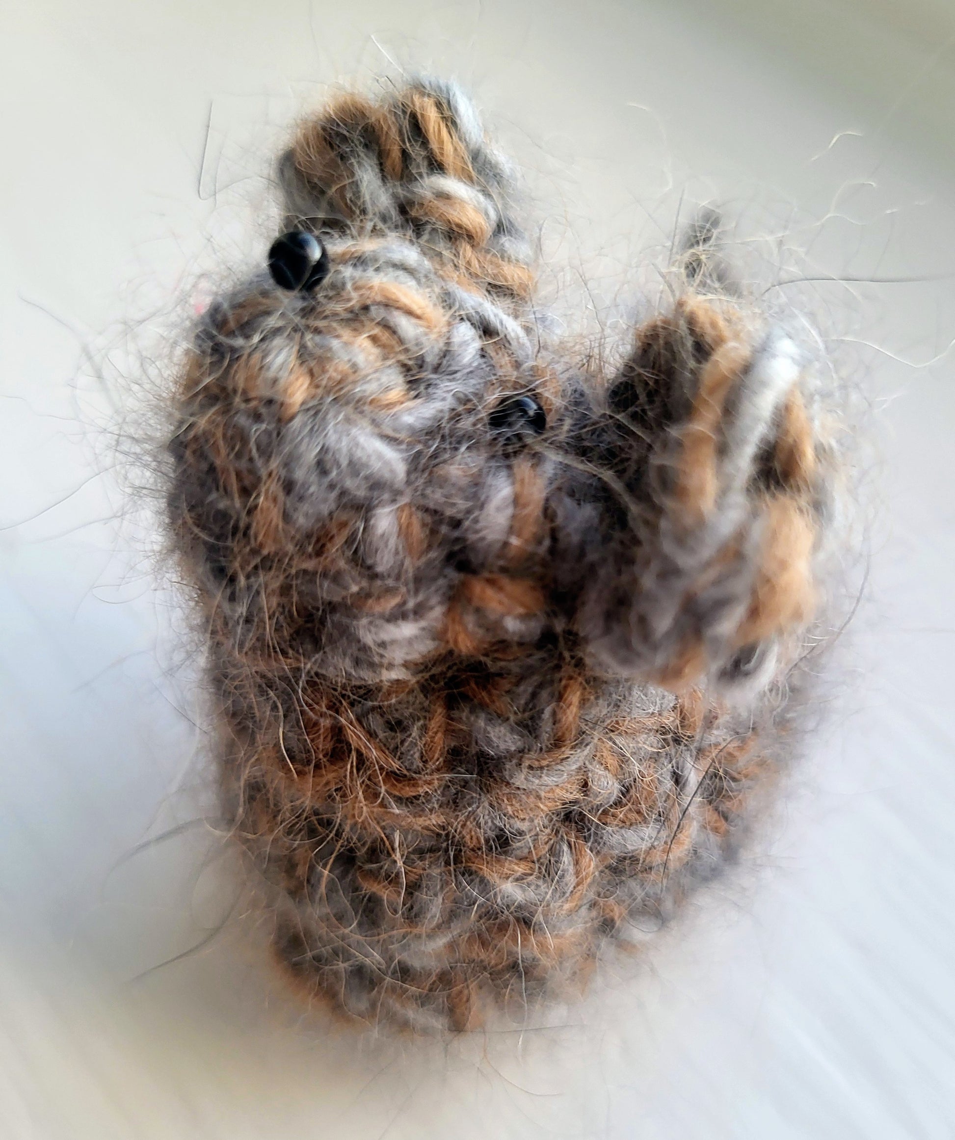Hekleoppskrift på en sjarmerende liten ullmus. Du trenger valgfritt garn, heklenål som passer til, evnt. svarte perler til øyne og nese, en ullnål til å sy musa sammen, og litt vatt, ull eller garnrester til fyll.