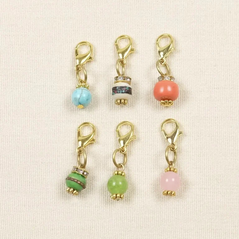 Nydelige maskemarkører med smykkestener. Ekte smykker som pynter opp strikketøyet samtidig som det gir bedre kontroll på telling og omganger. Med både ring til å ha på pinnen og karabinkrok for feste i maskene har markørene dobbel funksjon i tillegg til å være en fryd for øyet.