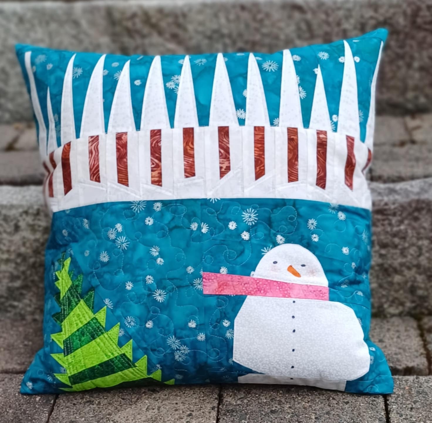Pute med quiltet snømann. Selges med innerpute. Mål 50 x 50 cm.