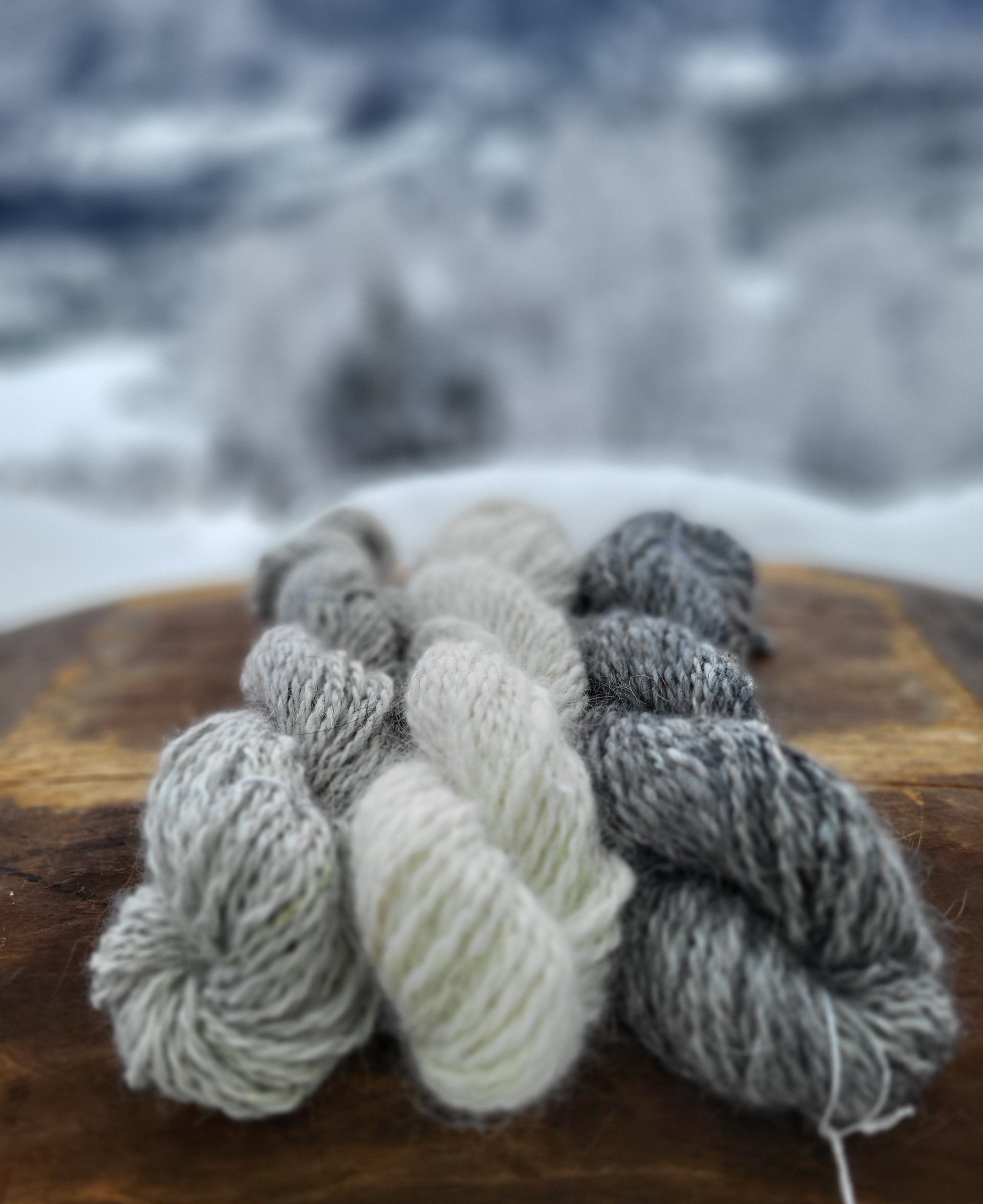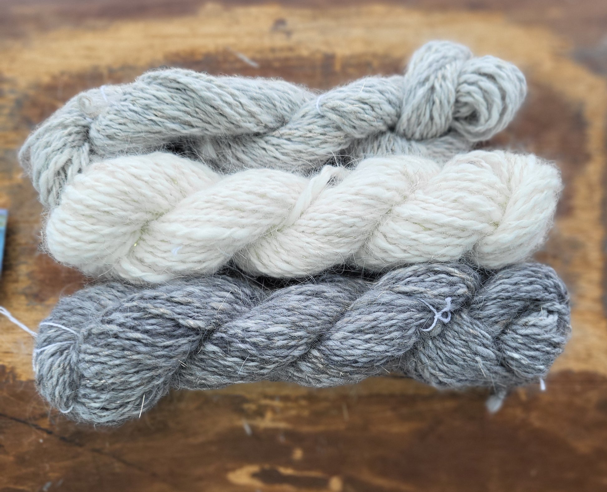 Sett med tre minihesper med håndspunnet angoragarn à 20 g.